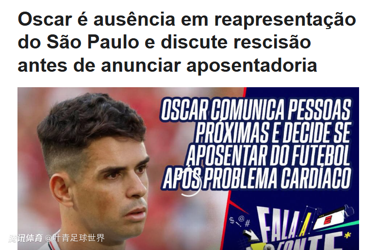 去年11月中旬,奥斯卡因血管迷走性晕厥住院五天,引发外界关注。34岁的奥斯卡基本不太可能继续职业足球之路。1月3日,ESPN消息透露,奥斯卡正与圣保罗商讨解约事宜。之后,奥斯卡将宣布退役。