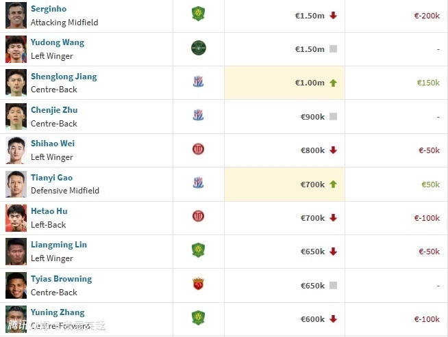 至于国足昔日头牌武磊,因为本赛季中超基本都在养伤,最新身价已经跌至50万欧元,已经跌出了中国球员身价前10名。而韦世豪身价也小幅下跌,最新身价为80万欧元。