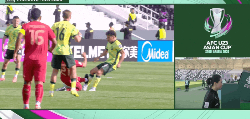 第11分钟,詹森飞铲对手,VAR介入后将其罚下,泰国队剩下时间10打11。