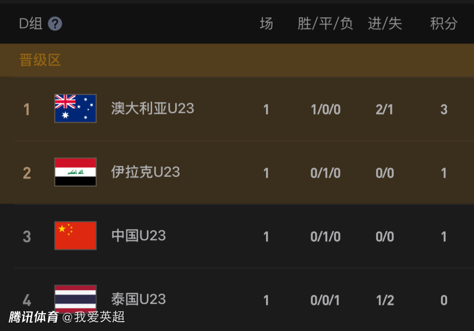 首轮战罢,澳大利亚队1胜积3分暂列榜首;U23国足和伊拉克都是1平积1分,并列积分榜第2位,泰国队1负积0分排名小组垫底。