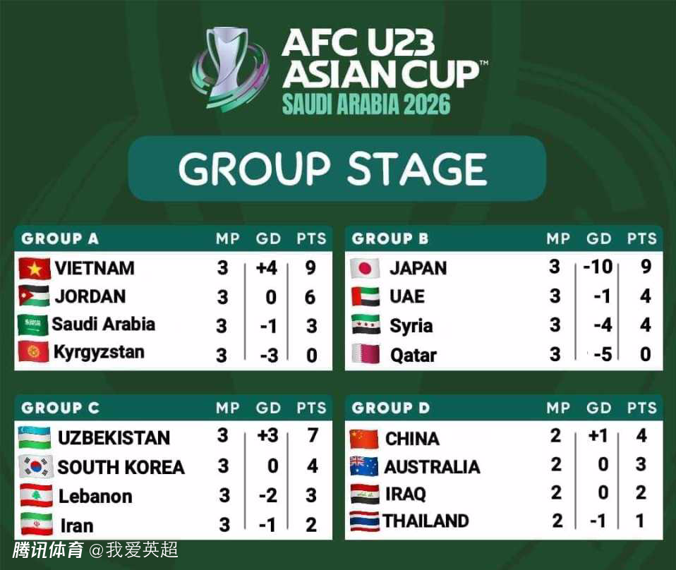 最后2席将在今晚D组末轮角逐后揭晓,目前U23国足1胜1平积4分暂列头名,澳大利亚3分第2,伊拉克2分第3,泰国1分垫底。