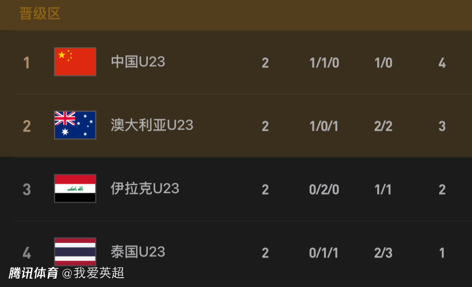 2.澳大利亚和伊拉克打平,同为4分的中、澳、泰将不得不比较相互比赛间净胜球,3队争2个出线名额;