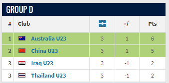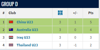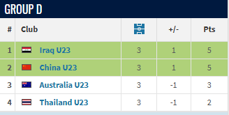 U23国足前2轮战平伊拉克,战胜澳大利亚;澳大利亚战胜泰国、负于U23国足,伊拉克两战皆平,泰国一平一负。前两轮之后,U23国足以4分排名榜首,澳大利亚以3分排名第二位,伊拉克、泰国分别以2分、1分排名第3、4位。