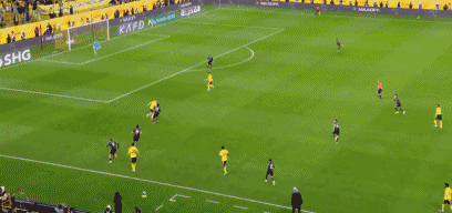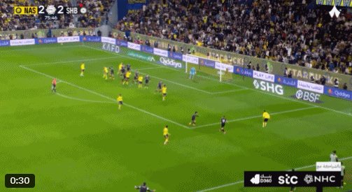 第76分钟,利雅得胜利抓住多踢一人的优势,安热洛-博尔热斯右路下底倒三角传球,科曼射门被封堵,加里卜混战当中补射得手,3-2!