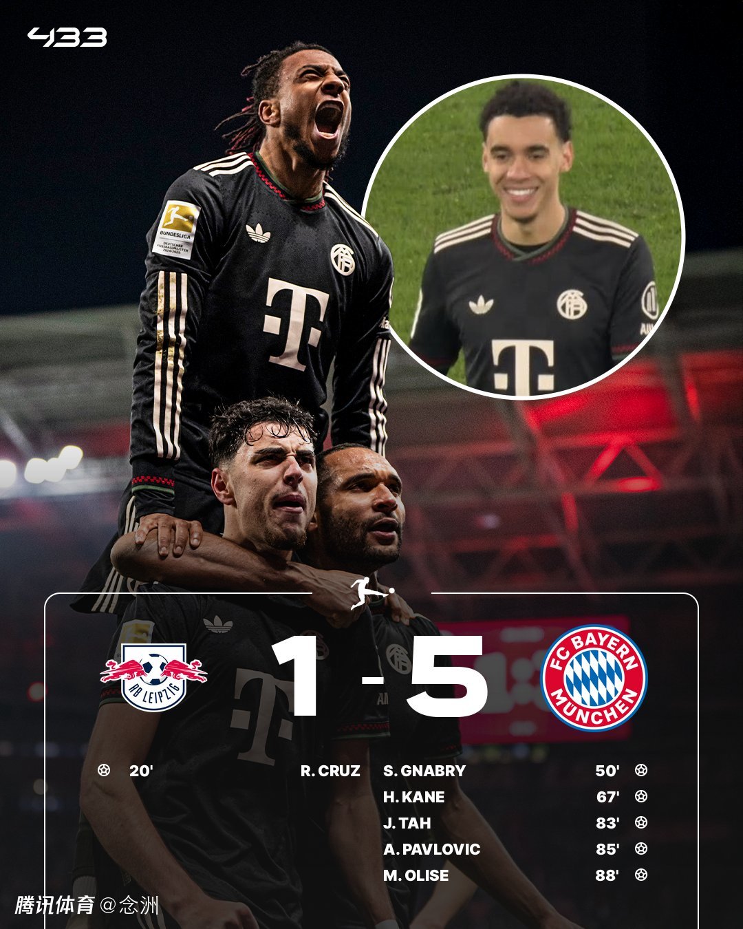 德甲第18轮,拜仁客场5-1大胜莱比锡,以11分优势领跑,罗慕洛先拔头筹,格纳布里3凯恩破门,迪奥曼德失单刀,塔、帕夫洛维奇、奥利塞连进三球,穆西亚拉复出送助攻。