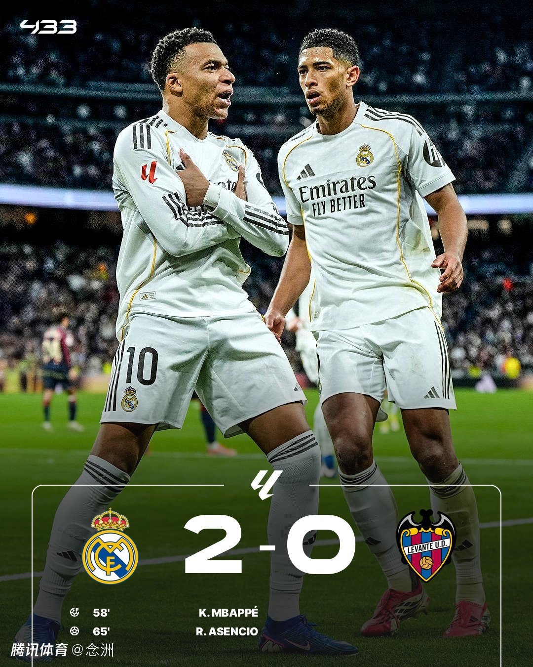 西甲第20轮,皇马2-0击败莱万特,先赛距榜首1分,阿韦罗亚收获执教皇马首胜。姆巴佩造点+点射打破僵局,居莱尔助攻阿森西奥头球破门扩大比分,马斯坦托诺兜射中楣。