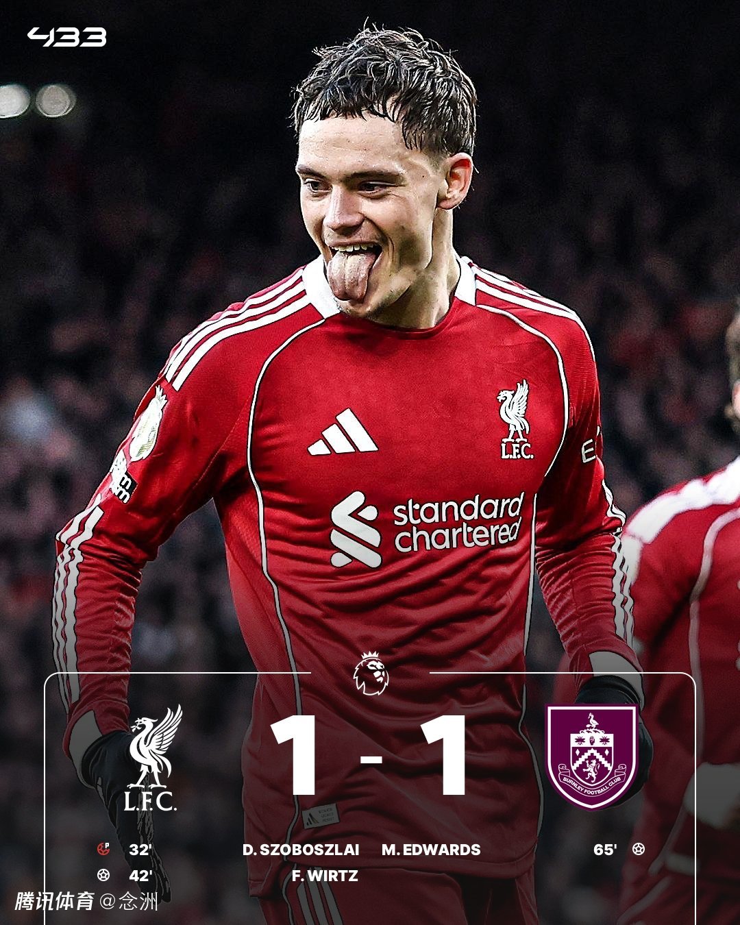 利物浦主场1-1伯恩利,遭遇4连平。加克波造点,索博斯洛伊点射中框,维尔茨打破僵局,加克波绝佳机会被汉弗莱斯门线解围,爱德华兹扳平比分。