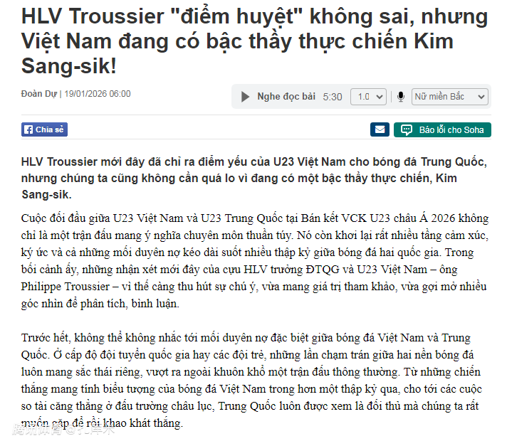 特鲁西埃在接受中国媒体采访时谈及越南U23的弱点,越南媒体《soha》则撰文表示,无需担忧特鲁西埃说什么,越南队有信心击败中国队。
