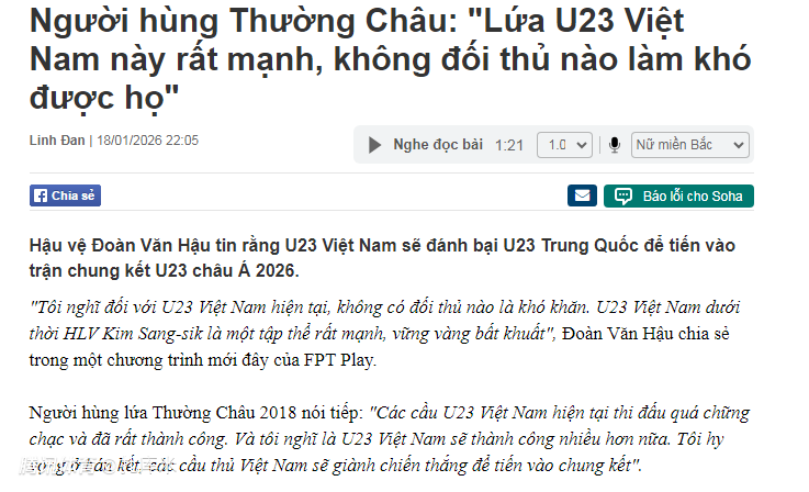 在U23亚洲杯半决赛越南队对阵中国队之前,越南足球名宿段文厚表示,没有任何对手是越南队无法击败的,半决赛越南队将击败中国队晋级决赛。