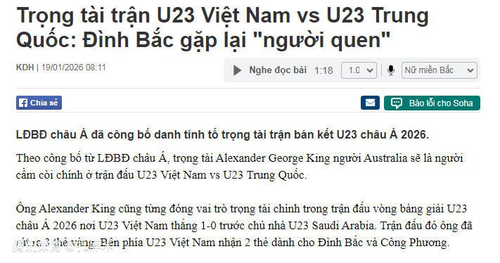 U23亚洲杯半决赛开打之前,亚足联官方公布了执法裁判名单,其中中国队和越南队的比赛由澳大利亚裁判亚历山大-金执法。越南媒体表示,亚历山大-金的执法较为严厉,小组赛曾执法过越南队的比赛。
