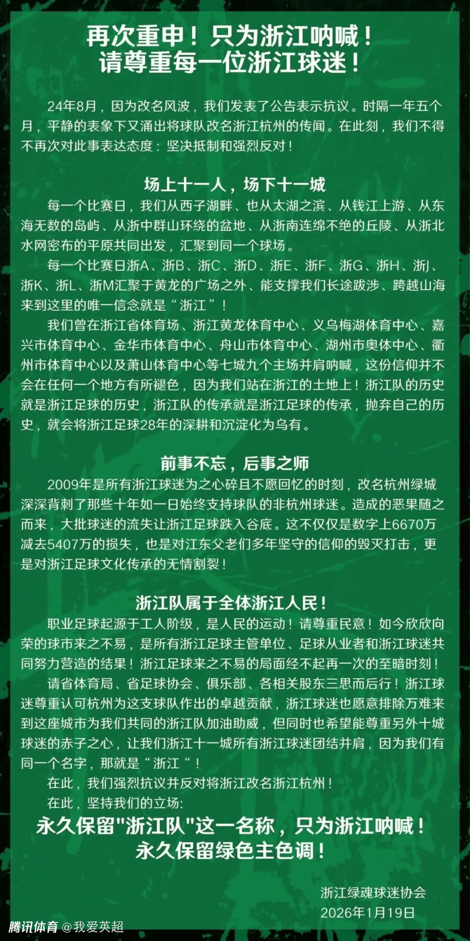 近日,有消息称中超劲旅浙江队,新赛季将更名为“浙江杭州队”。而北京时间1月19日晚,浙江队知名球迷组织“绿魂”发文以示抗议。