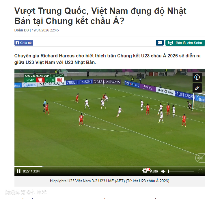 北京时间1月20日,U23亚洲杯半决赛,中国队将对阵越南队。赛前,苏格兰足球专家理查德・哈库斯表示,他期待越南队和日本队会师决赛。