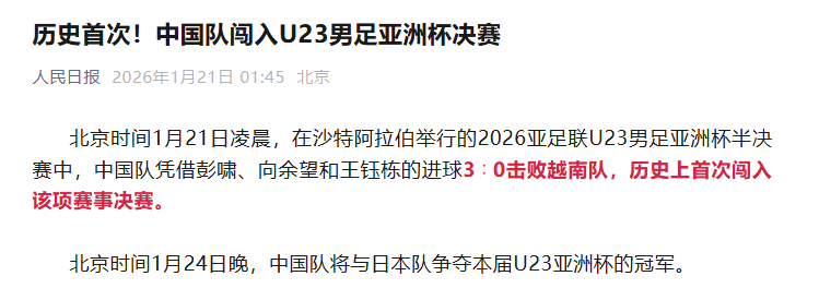 北京时间1月21日,在U23亚洲杯半决赛中,中国U23以3-0完胜越南U23,强势晋级决赛。而人民日报也发文祝贺国足U23挺进决赛。