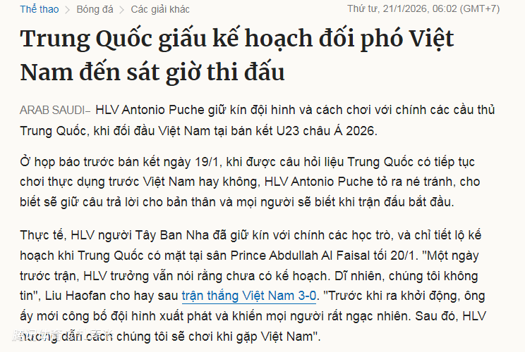 U23亚洲杯半决赛,中国队3-0战胜越南队晋级。赛后,根据越南媒体的披露,中国队主帅安东尼奥对首发阵容与战术打法严格保密,即便对队内球员也未提前透露,直至对阵越南队的比赛开打前。