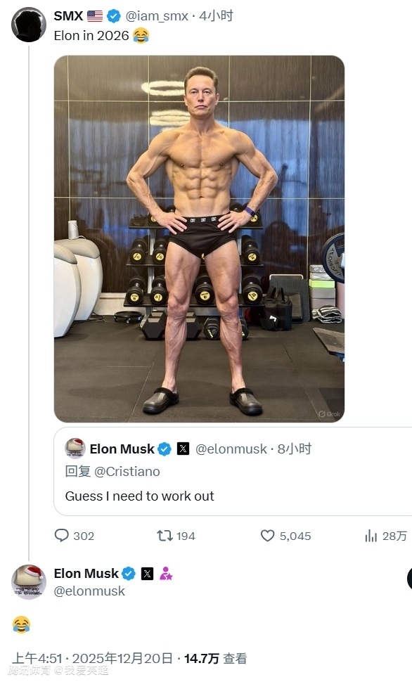 而北京时间12月20日,世界首富马斯克也关注了C罗这张炸裂身材照,并发表了评论。在看到40岁的C罗拥有如同刀刻斧凿般的肌肉后,马斯克在社交媒体上带着羡慕的语气评论道:“我想我需要锻炼一下了”。