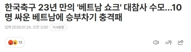 赛后,不少韩国媒体发文,将这场比赛形容为韩国足球的“巨大耻辱”。韩媒文章用“震惊!韩国足球时隔23年遭遇耻辱惨败”为标题进行了报道。