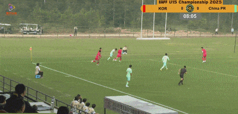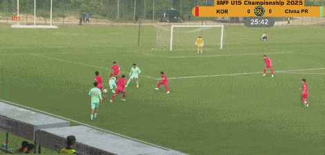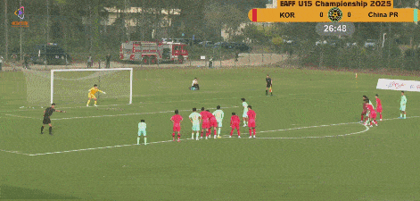 第26分钟,吴比乐在禁区内被绊倒,裁判果断判罚点球,潘朝伟操刀命中,U15国足1-0领先韩国。