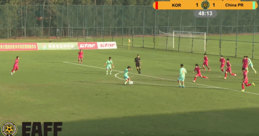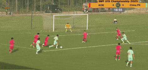 第53分钟,韩国队左路下底过掉防守,一脚抽射被江承恩扑出底线。
