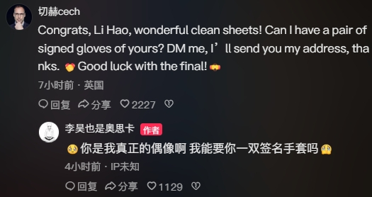 事实上,这并非两人首次产生互动。在本届U23亚洲杯期间,李昊凭借连续零封的稳定发挥,帮助中国队成功挺进决赛,其表现也吸引了切赫的注意。切赫此前曾主动在社交平台留言,与李昊互动,并表达了对其表现的认可,甚至提出希望获得签名手套。
