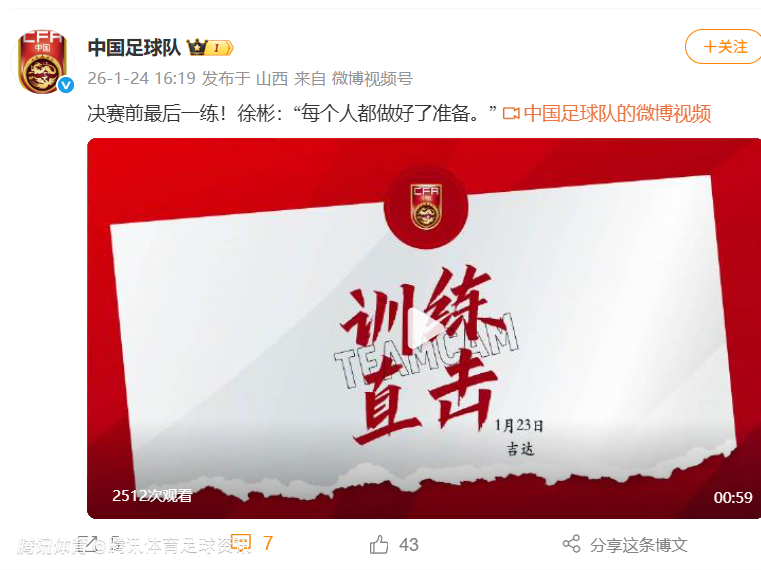 北京时间1月24日,中国足球队在官方社交媒体上发布了国足U23决赛前的最后一趟训练课视频。