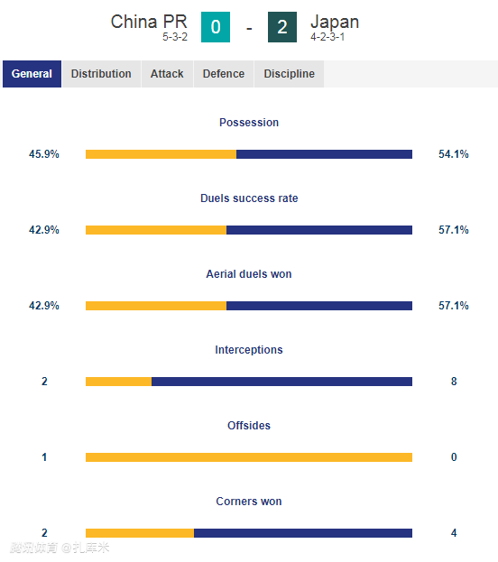 而在防守端,日本队的赢得对抗次数达到5次,而中国队只有2次。此外,两队的犯规次数相同,均为2次,但日本队有一次抱怨裁判判罚,吃到1张黄牌,而中国队则没有黄牌。而中国队的拦截次数只有2次,日本队则有8次成功拦截。