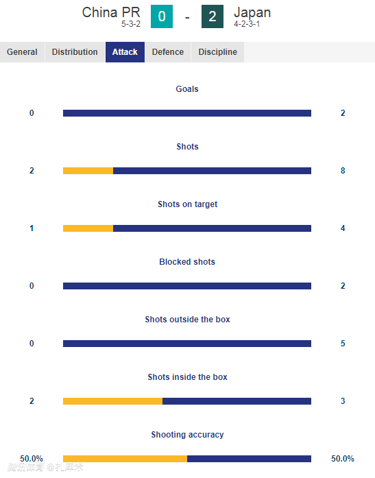 上半场比赛,中国队的控球率达到45.9%,而日本队则是54.1%,但相比此前的几场比赛,中国队的控球率明显上升。然而,中国队的射门次数却只有日本队的1/4,日本队8次射门,而中国队只有2次射门,对手4次命中目标打进2球,而中国队只有1次命中目标的射门,且未能给对手球门造成实质性的威胁。