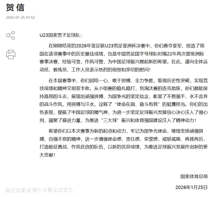 在刚刚结束的2026年亚足联U23男足亚洲杯决赛中,你们勇夺亚军,创造了我国在该项赛事中的历史最佳成绩,也是中国男足国字号球队时隔22年再次晋级洲际赛事决赛,经验可贵,作风可赞,为中国足球振兴燃起新的希望。在此,谨向全体运动员、教练员、工作人员表示热烈的祝贺和亲切的慰问!