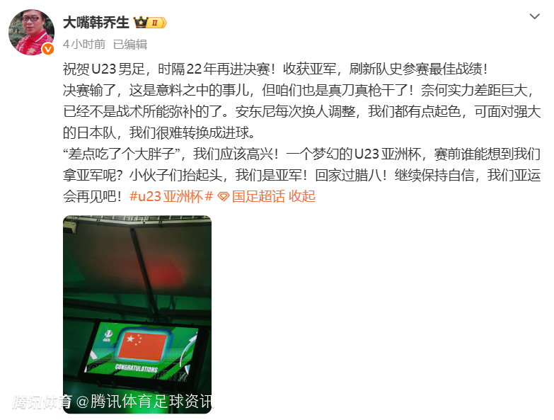 北京时间1月25日,U23亚洲杯决赛,U23国足不敌日本U23,收获赛事亚军,这也是队史参赛的最佳战绩。赛后,知名解说员韩乔生对比赛进行了评价。