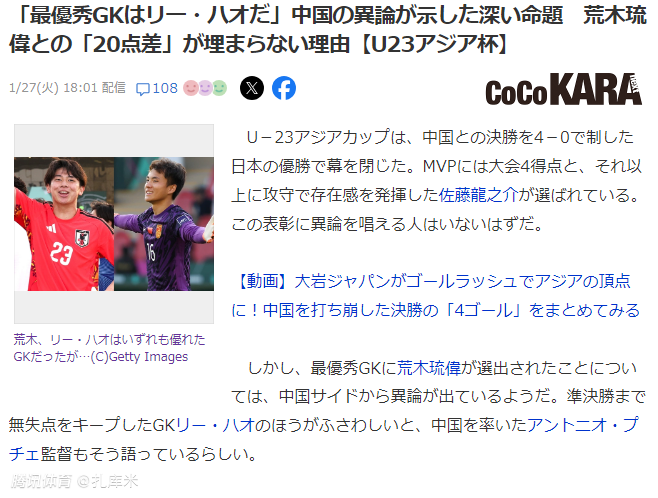 U23亚洲杯结束后,中国队主帅安东尼奥表示,李昊未能成为最佳门将是评选的不公平。不过日本媒体表示,李昊面临的试卷只有80分而已,而日本队门将不仅门前表现优异,甚至成为整个禁区的守护神。