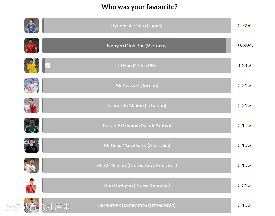 这不到4%的得票中,中国队门将李昊得到了1.24%的投票,而其余8名球员都没有达到1%,最多的只有0.72%,有4名球员只有0.1%的得票率。