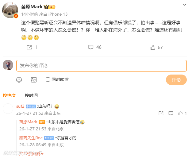 苗原周三透露,“这个假赌黑听证会不知道具体啥情况啊,但有俱乐部慌了,怕出事。这是好事啊,不做坏事的人怎么会慌!?你一堆人都在海外了,怎么会慌?难道还有漏洞。”“山东不是受害者吗?”