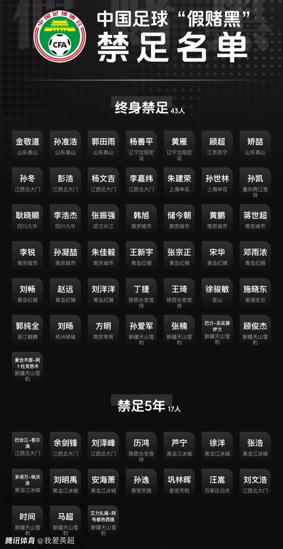 当时,中国足协公布首批禁足处罚名单,多达60人被罚,其中金敬道、孙准浩、郭田雨,顾超等43人被处罚终身禁足,而老将汪嵩等17人则被禁足5年。
