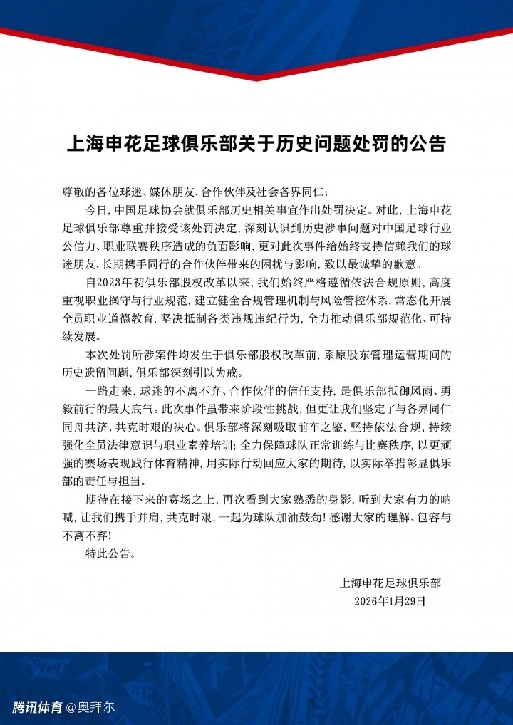 上海海港同样道歉,“上海海港足球俱乐部坚决拥护、全面接受该处罚决定,深刻认识到该事件损害了行业公信力与健康发展生态。在此,向所有受到影响的球迷、合作伙伴及社会各界,致以最诚挚的歉意。”