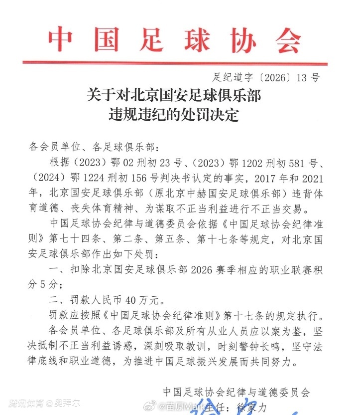 周四,中国足协正式公布受处罚俱乐部名单。北京国安被罚5分、罚款40万,博主清蒸树袋熊质疑道,“