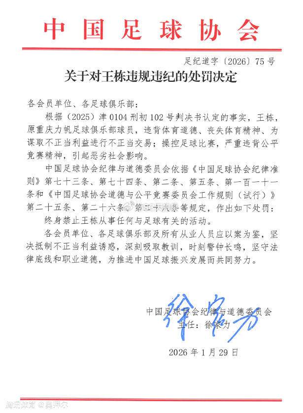 周四,中国足协正式公布受处罚俱乐部名单。天津津门虎被罚10分,王栋、邓小飞则遭到终身禁足。
