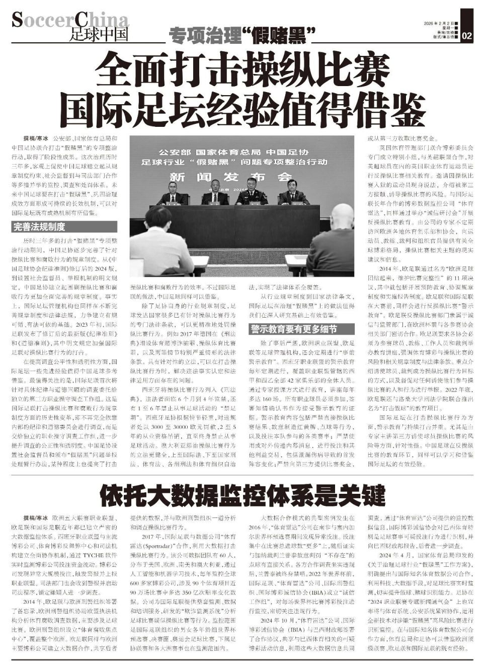 撰稿/寒冰 公安部、国家体育总局和中国足协联合打击“假赌黑”的专项整治行动,取得了阶段性成果。这次治理历时三年多,客观上促使中国足球建立起从规章制度约束、社会监督到与司法部门合作等多措并举的监控、调查和处罚体系。未来中国足球要在打击“假赌黑”、巩固治理成效方面形成可持续的长效机制,可以对国际足坛既有成熟机制有所借鉴。