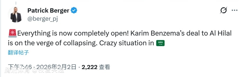 北京时间2月2日,来自德天空名记帕特里克-博格的最新消息,因为C罗罢赛抗议所造成的轰动效应,38岁的法国射手本泽马转会利雅得新月的交易濒临破裂。该记者表示:现在一切都充满变数,沙特联赛转会情况真是太疯狂了。