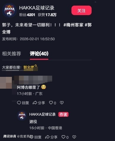 北京时间2月2日,来自长期跟踪关注梅州客家的知名博主“HAKKA足球记录”在社媒透露的消息,28岁的前国门、梅州客家主力门将郭全博将正式退役。据悉,郭全博被近视严重困扰,这或许也是他选择当打之年退役的重要原因。
