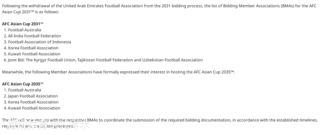 2035年的申办只有4家,即澳大利亚、日本、韩国和科威特,而这四国足协也提出了2031年亚洲杯的申办申请。亚足联方面也表示,将依据既定的时间安排、规则及评估流程,与各申办协会对接,协调其提交所需的申办文件。