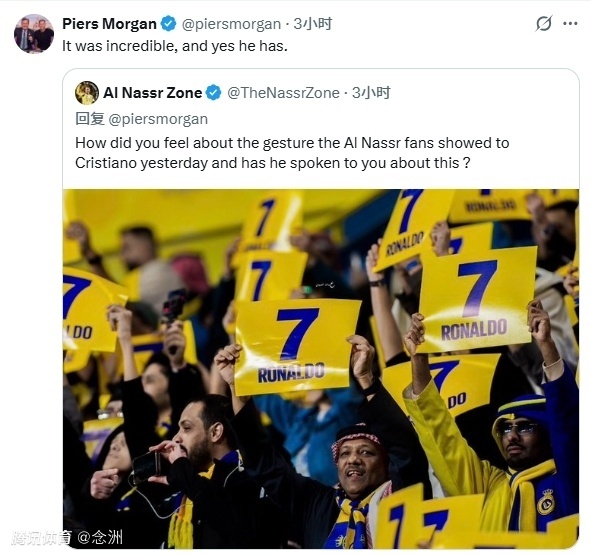 此外,英国知名记者、多次专访C罗的皮尔斯-摩根也力挺总裁。有网友质疑C罗:“他变得像个爱哭鬼。过去三年他表现得一塌糊涂。夏窗球队给他引进了很多顶级球员。真是被宠坏了!”摩根爆粗回应:“Bullsh*t,C罗彻底改变了沙特足球这是其他人做不到的,他只是想要公平的竞争环境。”