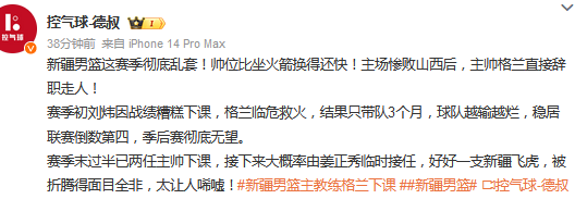 赛季初刘炜因战绩糟糕下课,格兰临危救火,结果只带队3个月,球队越输越烂,稳居联赛倒数第四,季后赛彻底无望。