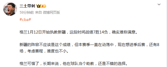 媒体人“三土带刺”发文点评:格兰1月12日开始执教新疆,这段时间战绩7胜14负,确实难称满意。