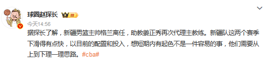 新疆男篮主帅格兰离任,助教姜正秀再次代理主教练。新疆队这两个赛季下滑得有点快,以目前的配置和投入,想短期内有起色不是一件容易的事,他们需要从上到下理一理思路。