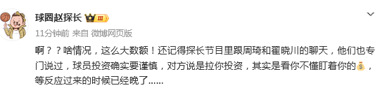 啥情况,这么大数额!还记得探长节目里跟周琦和翟晓川的聊天,他们也专门说过,球员投资确实要谨慎,对方说是拉你投资,其实是看你不懂盯着你的钱,等反应过来的时候已经晚了。