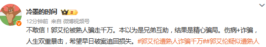 有知情人士透露,嫌疑人系郭艾伦身边好友,以“投资入股”为名诱导其转账近千万元。转账后,该嫌疑人一度失联,资金去向不明。