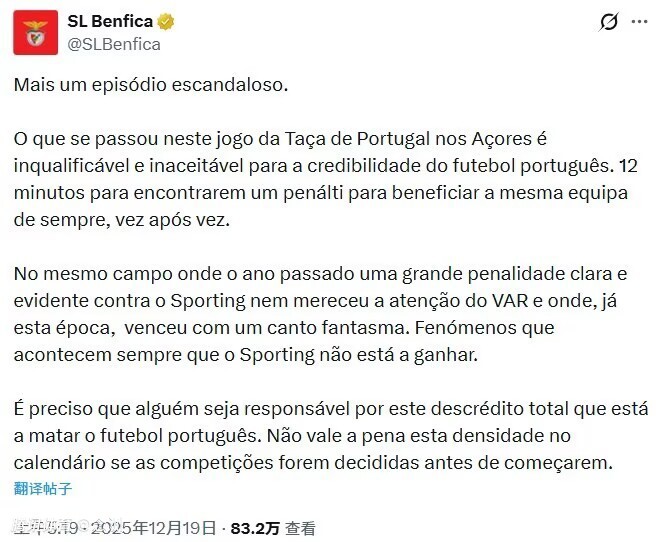 “就在同一个球场,去年明明葡萄牙体育明显应该被判点球,VAR却视而不见;本赛季早些时候,他们又靠一个根本不存在的角球取胜。每当葡萄牙体育落后或局面不利,这类‘奇迹’就总会发生。必须有人为这种彻底摧毁葡萄牙足球信誉的行为承担责任!如果比赛结果早在开球之前就已注定,那么再密集的赛程、再激烈的竞争又有什么意义?”