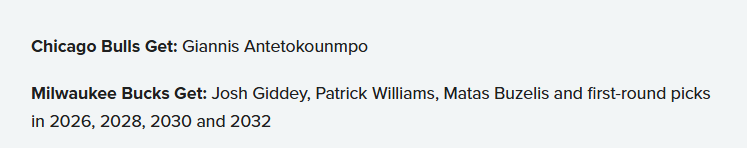 得到字母哥,会让公牛更容易吸引其他球星加盟。字母哥搭配一名顶级帮手,就能让公牛成为东部争冠热门。
