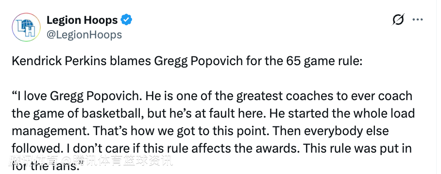 帕金斯表示:“我很尊敬波波维奇,他是篮球史上最伟大的教练之一,但这件事确实是他的锅。正是他开启了负荷管理的先河,才一步步发展到如今的局面,然后所有人都开始跟风效仿。我才不在乎这条规则会不会影响奖项评选,它本来就是为球迷制定的。”