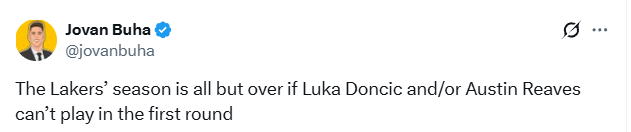 McMenamin表示,一位接近东契奇的消息人士透露,他显然对自己无法在赛季这个关键阶段和队友并肩作战感到难过,但他正全身心专注于康复。另一位球队内部人士则表示:“希望其他球员能够站出来。” 还有一位球队消息人士提到这次伤病的时机,坦言现在确实很难接受,但情况本可能更糟。他们还有常规赛最后五场比赛可以调整阵容,而且湖人已经直接锁定了季后赛席位,在附加赛期间他们还能获得整整一周的训练时间,球队也已经尽快开始调整阵容。