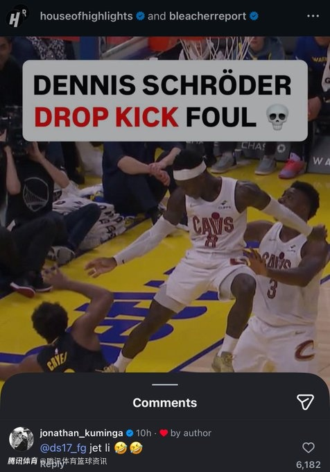 赛后,美国媒体Bleacher Report在社交平台晒出这一犯规片段,施罗德的前队友库明加评论调侃道:“你以为自己是李连杰啊!施罗德。”
